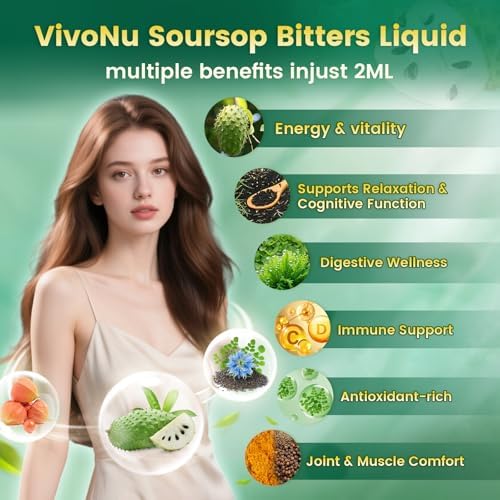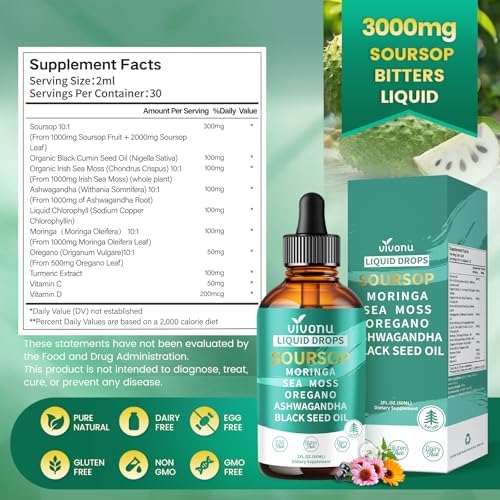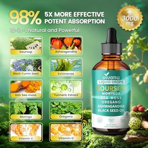VivoNu 3000mg soursop drop, 10-in-1 Super Herb Blend with Soursop, Organic Black Cumin Seed Oil, Organic lrsh Seamoss, Ashwagandha, Liquid Chlorophyll, Moringa, Oregano, Turmeric Extract, Vitamin C, Vitamin D, for helping your body cope with the stresses of modern life. It works to fight fatigue and naturally elevate your energy levels and mental focus, promoting a sense of calm and balance