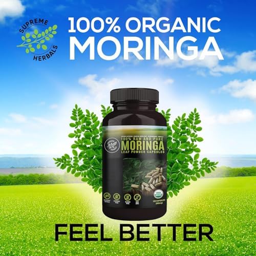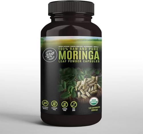 100% Raw and Pure Moringa Leaf Powder Capsules. Organic Certified Moringa Leaf. Natural Superfood with Essential Amino Acids, Antioxidants and Omega 3, 500mg, 120 Capsules.
