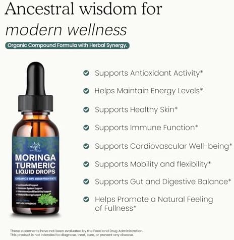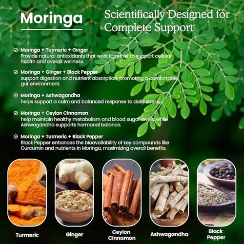 【6-in-1 Enhanced Synergistic Formula】 This unique liquid supplement combines organic moringa extract (1000mg) with powerful synergistic botanicals: Turmeric, Ginger, Ceylon Cinnamon, Ashwagandha, and Black Pepper Extract. This formulation optimizes antioxidant benefits, supports cardiovascular health, supports digestive comfort and overall gut function, helping maintain a feeling of balance and satiety. The addition of Black Pepper Extract significantly enhances nutrient absorption.
