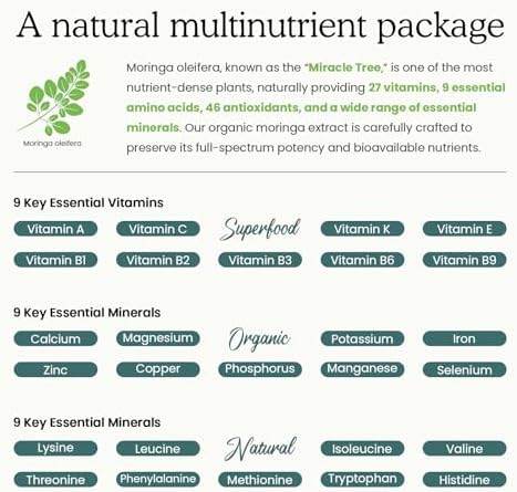 【Outstanding Health Benefits】 Our moringa leaf extract supplement harnesses the essence of moringa oil, renowned for its exceptional antioxidant properties. It helps protect against oxidative stress, support cellular energy, maintain healthy skin, and contribute to cognitive and immune wellness.