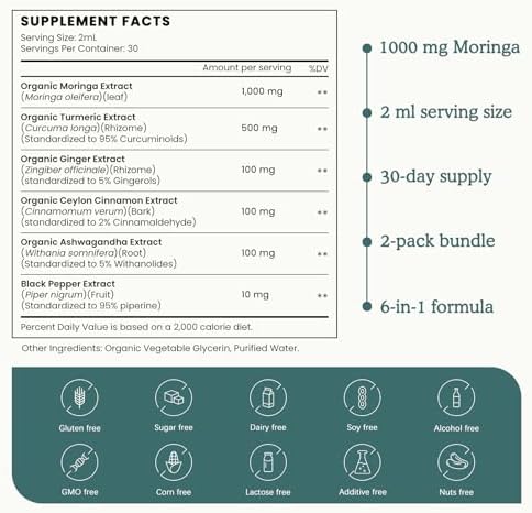 (2 Pack) Organic Moringa Leaf Extract Liquid Drops Supplement 1000mg with Turmeric and Black Pepper for Energy, Antioxidant and Skin, Green Superfood Supplement for Women Men, Vegan, 1 Fl Oz