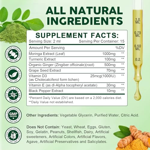 (2 Pack) Organic Moringa Liquid Drops, Moringa Supplement with Turmeric, Black Pepper, Grape Seed Extract, Pure Moringa Oleifera Leaf Extract for Skin, Gut, Immune Support, More Potency Than Powder