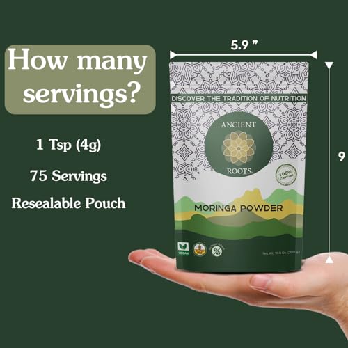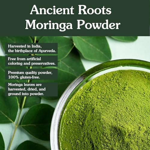 Ancient Roots Moringa Powder 100% Pure & Natural, Non-GMO, Gluten-Free Finely Ground Moringa Leaf for Smoothies, Teas, and Recipes 10.5 oz Resealable Bag