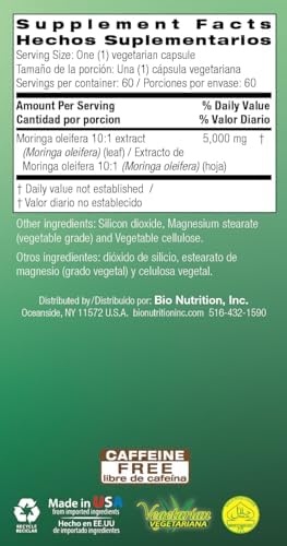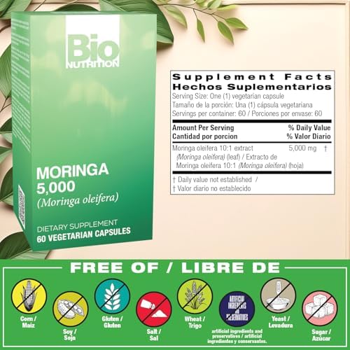 Bio Nutrition Moringa 5000mg 60 Vegetarian Capsules | Complete Green Superfood | Nature’s Multivitamin | Energy and Gut Health