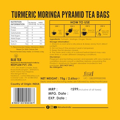BLUE TEA – Turmeric Tea – Moringa – 30 Count – Pyramid Plant Based Tea Bag | CURCUMIN RICH – HERBAL BLEND | Caffeine Free – Vegan – Herbal Tea – Mild Flavor – Healthy | Reusable Tin Pack