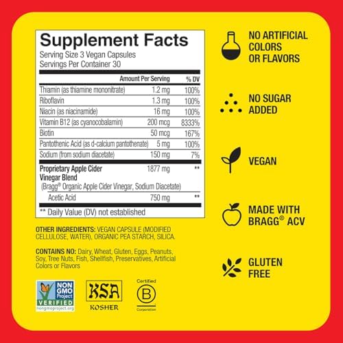 Bragg Energy Apple Cider Vinegar Capsules with B-12 Vitamins – 90 Capsules – Weight Management – Non-GMO, Vegan, Gluten Free, No Sugar – Helps Generate Energy at Cellular Level for Men and Women