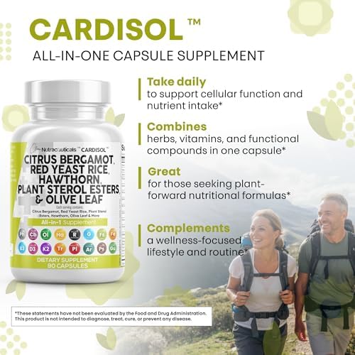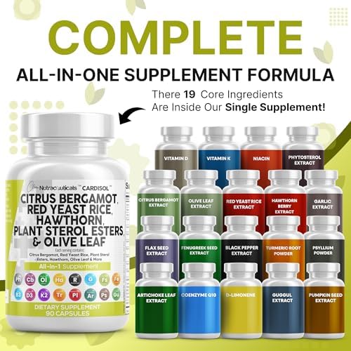 Clean Nutraceuticals Citrus Bergamot Red Yeast Rice Capsules with Plant Sterols – with Hawthorn Extract Olive Leaf Niacin Vitamin K3 D3 COQ10 Guggul & More