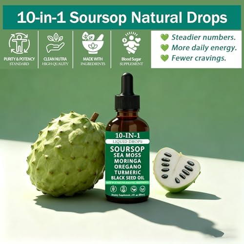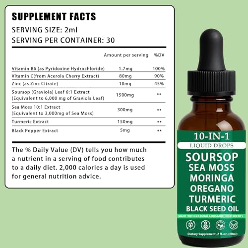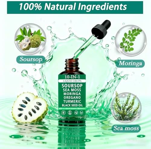 GraviGlow Soursop Natural Drops – 10-in-1 Soursop Extract Liquid Drops with Sea Moss, Moringa, Turmeric Oil, Black Seed Oil, Oregano for Overall Health, Joint Support, Vegan, Non-GMO 2 Fl Oz