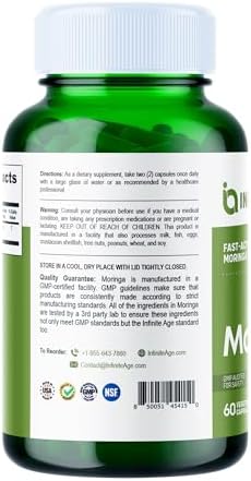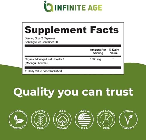 INFINITE AGE 1000mg Organic Moringa Leaf Powder Capsules, 60 Count – Made in The USA, Vegan, Gluten Free, All-Natural – Antioxidants, Liver and Kidney Support Supplement