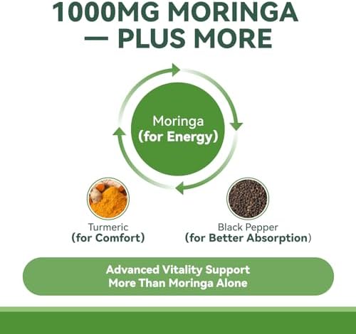 Moringa Capsules 1000mg, Moringa Leaf Extract 10:1, Complete Green Superfood, for Energy, Sleep, Immune & Gut Health, Veg Capsules 60 Count, All-Natural, Non-GMO, Made in USA