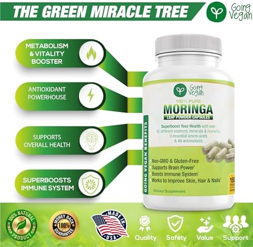King Of All Superfoods – With over 92 different vitamins, minerals and nutrients such as A, B6, C, E, zinc, iron, quercetin, kaempferol, potassium, calcium, magnesium, 46 antioxidants and 9 essential amino acids to improve overall health, Moringa oleifera leaves deservedly called the KING OF ALL SUPERFOODS! A small serving of our moringa tablets contains 15X more potassium than bananas, 10X more vitamin A than carrots, 25X more iron than spinach, 17X more calcium than milk, 8X more magnesium than kale, 20X more vitamin E than tofu, 7X more vitamin C than oranges.Immune System Booster – Superboost your immune system with moringa oleifera leaves (capsulas de moringa) – Mother Nature’s most powerful immune system booster because one of the best moringa oleifera benefits is its super immune-boosting powers. Maintaining a strong immune system is essential for helping our bodies stave off health issues and illnesses. Our moringa supplement is an extremely rich source of iron and vitamin A. Both of these are essential for the normal function of the immune system!Supports Overall Health – With its almost unlimited bounty of vitamins, minerals, and nutrients, many of them with powerful immune system boosting properties, studies show that moringa pills/moringa oleifera leaf capsules could help ease symptoms and complications of many health issues while supporting overall health!Supports Life Energy And Vitality – Organic moringa powder capsules also help support the oxidative balance of the body and thus boost metabolism, vitality, and life energy. The active ingredients in moringa tablets include beneficial plant-based antioxidants to help support digestive health. In addition, naturally occurring protein found in moringa oleifera leaves can help promote strong muscle tissue and encourage muscle growth!Going Vegan Premise – We provide products that are supposed to exceed the expectations of our esteemed customers by delivering excellent quality. You can purchase our product with confidence knowing if for any reason our moringa tablets should not meet your expectation, just ship it back to us!