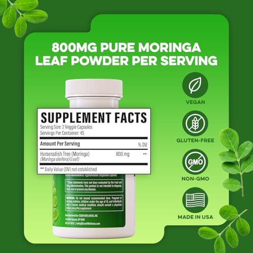 Moringa Capsules 800mg – Pure Moringa Powder Capsules Superfood for Energy, Immunity, Skin, Joint, Gut Health — Daily Nutrition & Wellness Supplement — Vegan, Non-GMO, USA Made (45-Day Supply)