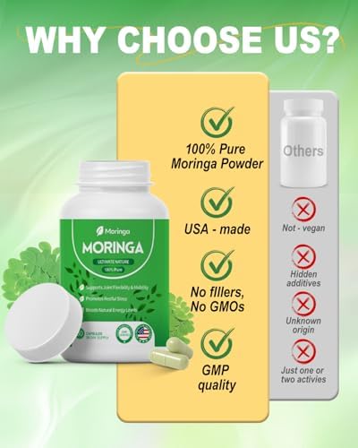 Plant-Based Nutrient Boost: Take 2 capsules a day delivers 800mg of moringa powder organic, this vegan supplement provides vitamin A, C, calcium, potassium, iron, and plant-based protein—contributing foundational nutritional elements