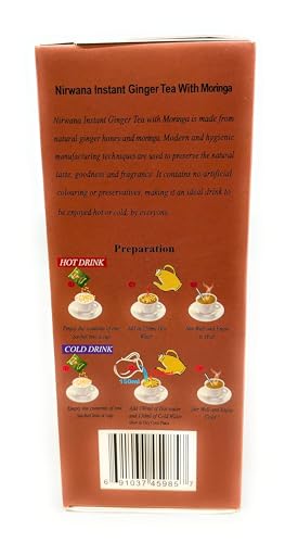 Nirwana Moringa Ginger Tea (Herbal Instant Tea) is made from the best quality. It is sourced directly from farms, retaining its natural taste, flavor, and aroma. Our tea is healthy, authentic, and free of any artificial preservatives or chemicals. Moringa is a widely cultivated plant originating from Northern India and around the subcontinent. Moringa leaves include many important vitamins, and nutrients, including protein, calcium, iron, vitamin A and many more health benefits.