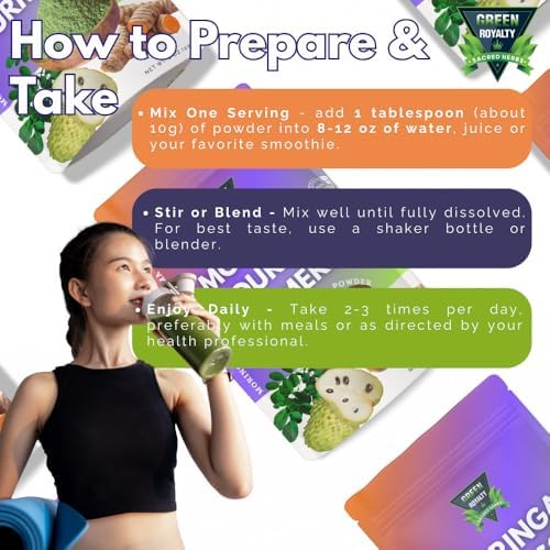 Discover the power of nature with Green Royalty’s Moringa, Soursop & Turmeric Powder—a unique blend of three nutrient-rich superfoods. Specially crafted to support daily wellness, this herbal mix provides natural antioxidants, plant-based nutrients, and refreshing vitality. Our resealable pouch keeps the powder fresh, while the fine texture makes it easy to mix into water, smoothies, juices, or your favorite recipes. Whether you’re looking to add extra nutrition to your day or explore traditional herbal blends, this powder is a simple and versatile choice.