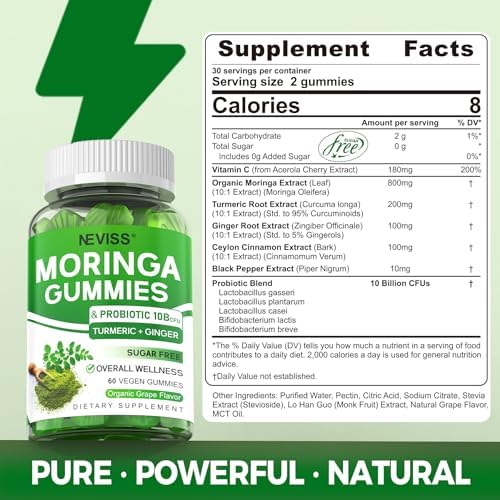 Moringa Gummies for Women Men w/Probiotic Turmeric Ginger Ceylon Cinnamon, Sugar Free, Organic Moringa Powder Capsules Alternatives, Pure Moringa Leaves Green Superfood Supplement – Vegan, 120Cts