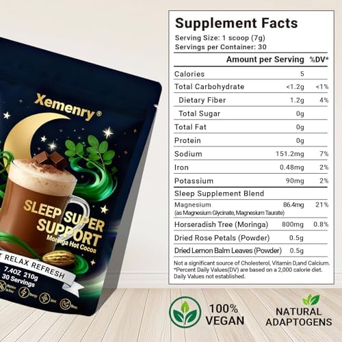 Moringa Hot Cocoa Sleep Aid, Pure Moringa Powder Mix with Cocoa Powder – Supports Energy, Immune Support, Gut Health, Green Superfood with Vitamins & Amino Acids, 7.4 oz., 30 Servings