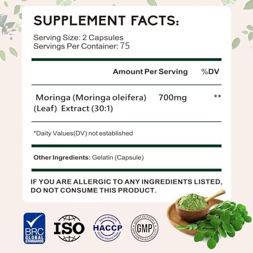 Convenient & Easy to Integrate: With a simple serving size of just two capsules, our supplement is easy to incorporate into your daily routine. The 30:1 extract ratio means you get a highly concentrated dose of Moringa’s benefits, without having to consume large amounts of raw powder. The bottle provides 75 servings supply.