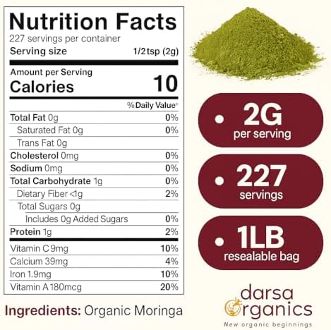Pure, Natural, and Chemical-Free – Darsa Organics Organic Moringa Oleifera Powder is cultivated without synthetic fertilizers, pesticides, or additives. Just 100% pure moringa leaf powder, rich in essential vitamins, minerals, amino acids, and antioxidants for whole-body wellness.