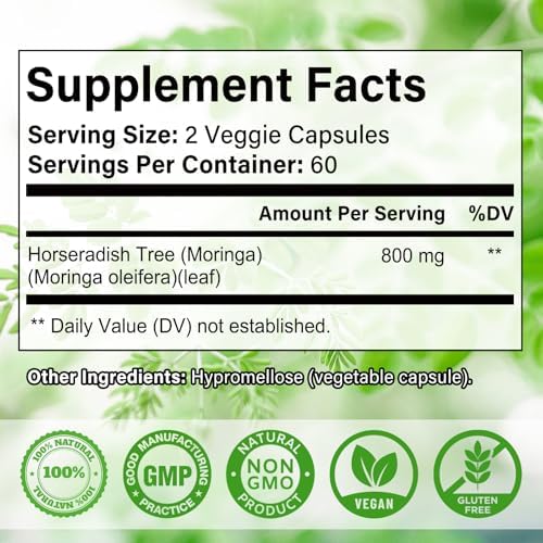 PURE GREEN SUPERFOOD: Made from pure Moringa leaf powder, each Plant-Based delivers carefully selected Moringa Oleifera. 120 Moringa Capsules Per Bottle, 800mg Of Moringa Per Capsule.