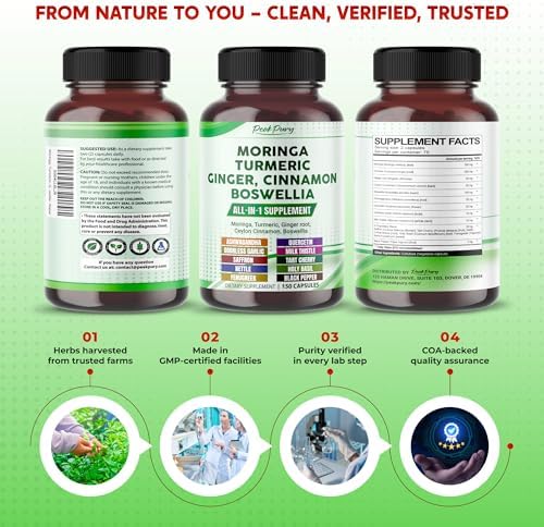 Unique Fusion: This supplement combines Moringa, Turmeric, Ginger, Ceylon, Boswellia, Ashwagandha, Quercetin, Odorless Garlic, Milk Thistle, 5 s from a proprietary blend, and Black Pepper.