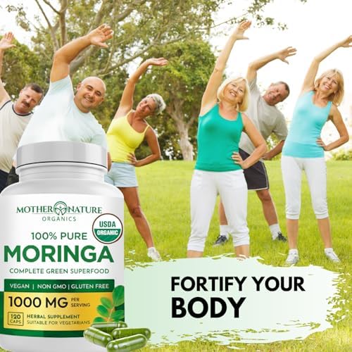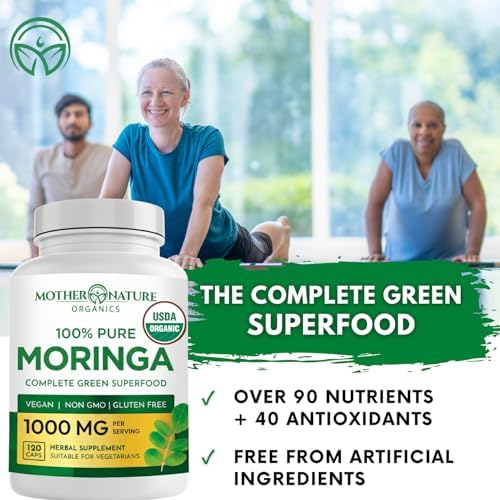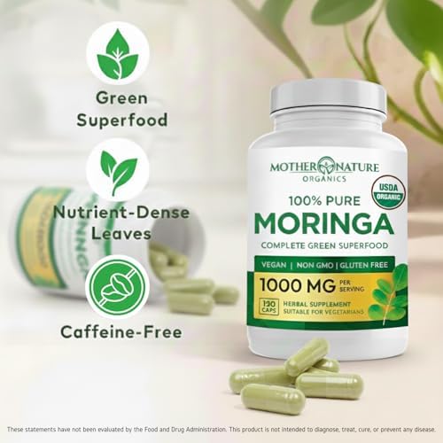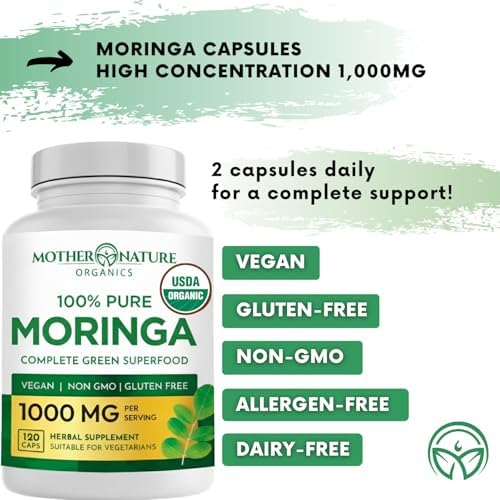 Mother Nature Organics Moringa Capsules – Organic Moringa Leaf Powder, Single Origin, Energy & Immune Support, Metabolism, Focus, Vitamin C – Vegan, 500mg, 120 Capsules