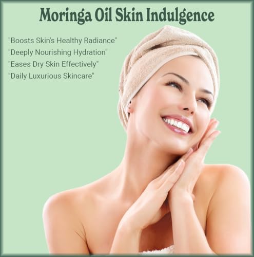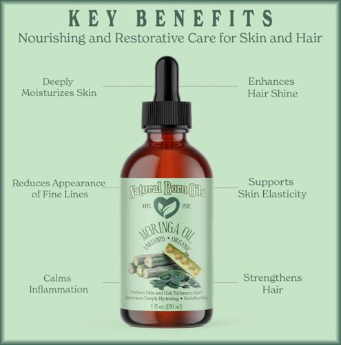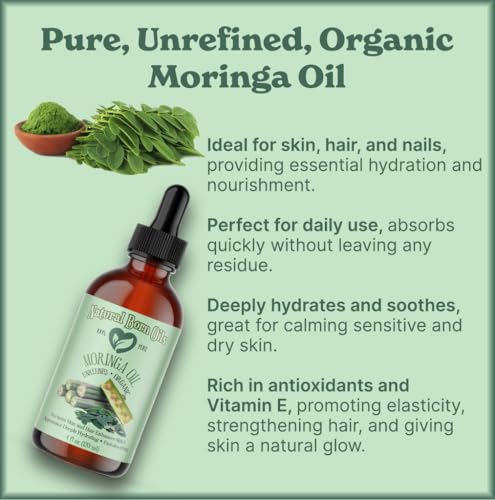 100% PURE MORINGA OIL Botanical name: Moringa oleifera Cold-Pressed, Unrefined, Organic Natural Moisturizer for Skin and Hair This delightful oil is highly moisturizing, making it a great choice for skin and hair care. Easy to use and readily absorbed, Moringa Oil helps in enhancing the natural radiance of skin and hair. Containing oleic acid, Moringa Oil is perfect for everyday use, suitable for all skin types. Use directly on skin or mix it with essential oils for your own special blend. 100% pure. Organic. Unrefined. Cold pressed. Natural. Vegan. Easily absorbed. Highly moisturizing. Lightweight. Paraben-free. Sulfate-free. Colorant-free. Preservative-free. Additive-free. Cruelty-free. Bottled in the USA. Origin Story The Moringa tree, native to India, produces seeds that yield a greenish-gold oil after cold-pressing. The Process The oil is cold pressed from the seeds of the Moringa Tree, ensuring the preservation of its nutrients and antioxidants.