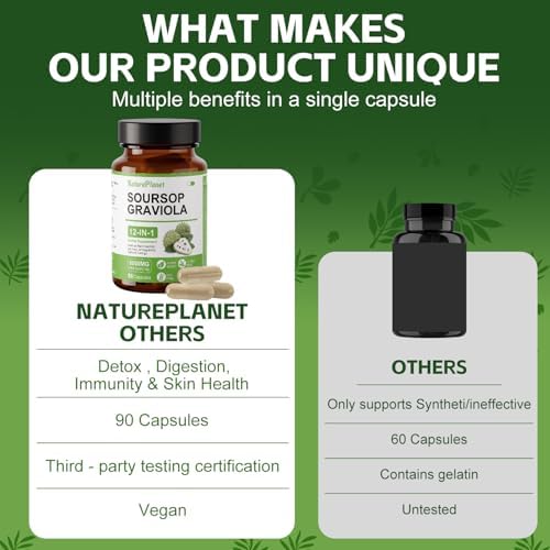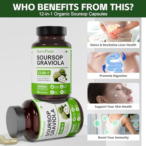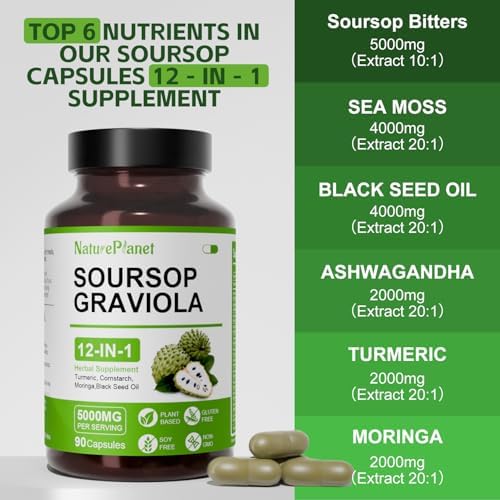 【Comprehensive Herbal Blend for Wellness】NaturePlanet Soursop Graviola combines 12 potent herbs like Black Seed Oil, Sea Moss, and Ashwagandha in one formula. This rich blend supports overall wellness with essential nutrients, antioxidants, and plant extracts. Perfect for those seeking a natural, multi-ingredient supplement to enhance their daily health routine