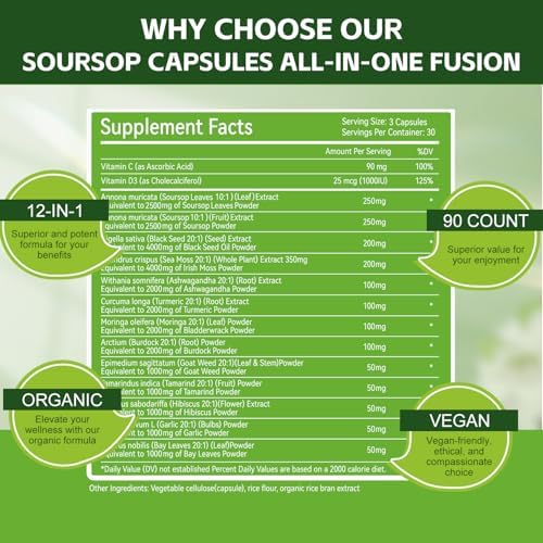 【Organic Purity, Trusted Quality】Zero Compromise on Clean Ingredients: Made with certified organic soursop fruits, free from synthetic additives,harmful chemicals, or GMOs. Vegetarian-friendly cellulose capsules ensure universal compatibility