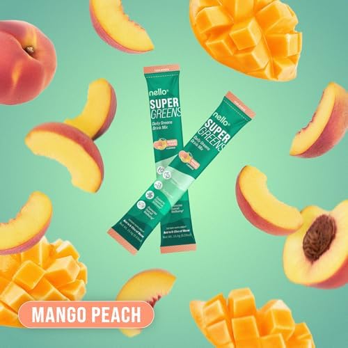 Nello Supergreens Premium Superfood Greens Drink Mix w/Chlorella, Moringa, Spinach & Broccoli + Digestive Enzymes & Probiotic Blend -Nutrient-Packed Powder Wellness (Mango Peach, 20 SRV, Travel Pack)