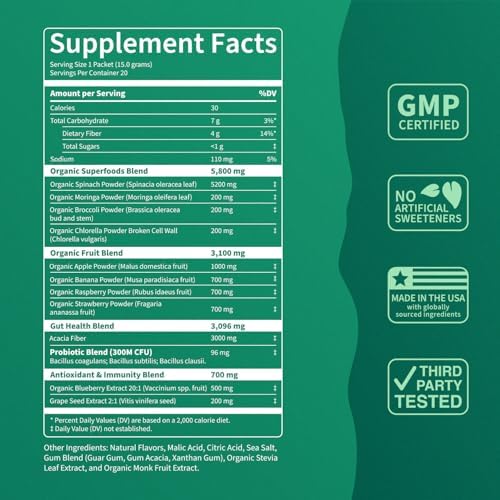 FULL SERVING OF GREENS: Nello’s Supergreens contains a full serving of greens, curated to enhance your daily health routine. Nello’s Supergreens includes 200 mg of Moringa, 5,200 mg of Spinach, 200 mg of Chlorella, a 5 billion CFU probiotic blend, and 4 g of fiber. This greens powder supplement helps you lay the ideal foundation for your body’s defenses and overall health.