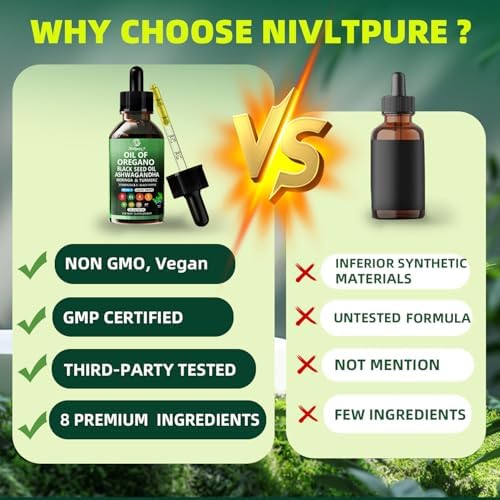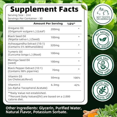 【A powerful all-in-one oregano supplement】Ashwagandha extract vitamin D3 and vitamin E unites with bioactive D3 + E, oregano, black seed oil and olive leaf to create a comprehensive immune boosters for adults solution. Balanced D3 and vitamin E supplement ratios aid calcium utilization while antioxidants fight free radicals. Each 2ml of oregano oil offers 30 servings. With a precise dropper and mild taste, it’s easy to mix and perfect for daily use.