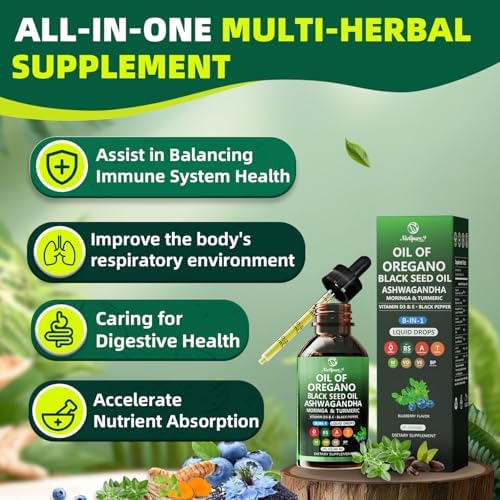 Oil of Oregano with Black Seed Oil | 8 in 1 Organic Oregano Oil Drops with Ashwagandha, Moringa & Turmeric | Natural Herbal Supplements for Immune Support & Stress Relief | Vegan Friendly, 2 Fl Oz