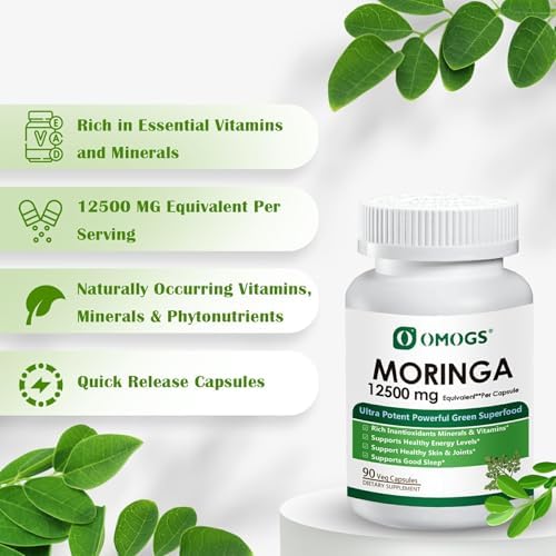 OMOGS Moringa Capsules, Pure Moringa Oleifera Leaf Powder Supplement, Rich Inantioxidants Minerals & Vitamins, for Energy, Metabolism, Immunity & Sleep, Non-GMO, 90 Veg Capsules