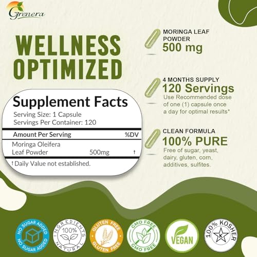 VEGAN, NON-GMO & CLEAN LABEL – Grenera Moringa Capsules are vegan-friendly, non-GMO, and made without artificial additives. Suitable for those looking for a pure and natural plant-based dietary supplement.