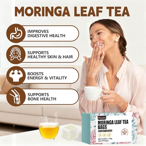 Organic Moringa Tea Bags, 50 Teabags, 3g/Bag, Made with 100% Natural Moringa Leaves. Helps with Digestion, Caffeine-Free, Sugar-Free, Gluten-Free,Vegan. Individually Packaged in Eco-Friendly Bags
