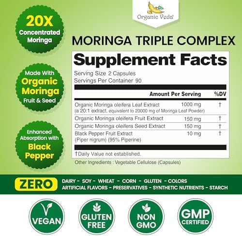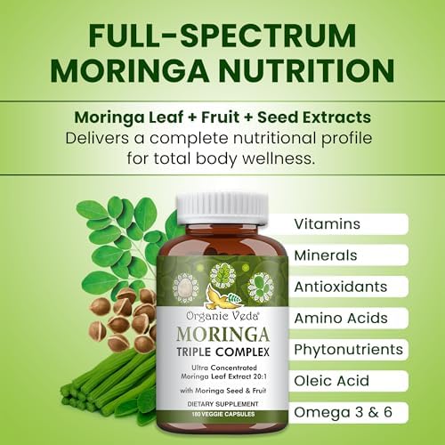 Organic Veda Moringa Capsules Triple Complex – 20 X Concentrated Organic Moringa Leaf Extract with Seed & Fruit Powder Vitamin, Antioxidant – Joints & Energy Support – 180 Vegan Capsule