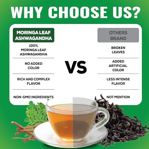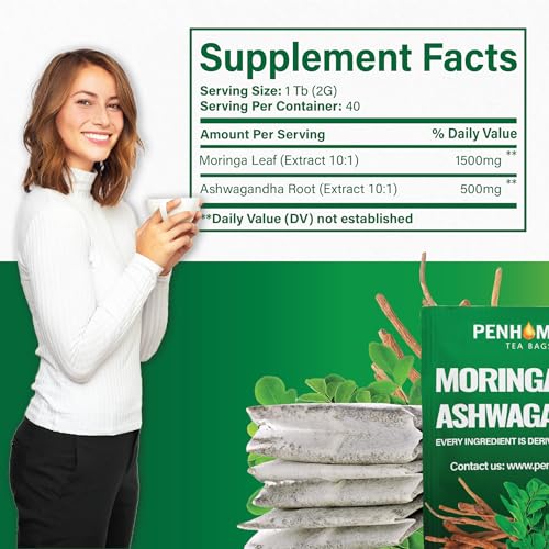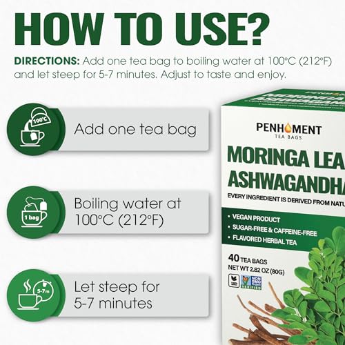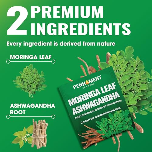 PENHOMENT Moringa Leaf Tea Bags with Ashwagandha – 40 Tea bags, 2gr/bag – Non-GMO/Caffeine free