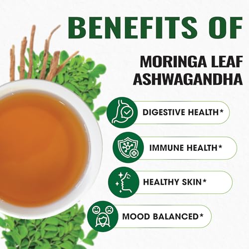 Benefits: Enjoy the harmonious blend of Moringa Leaves with organic Ashwagandha extract designed to support digestive health, immune wellness, healthy skin, and balanced mood.