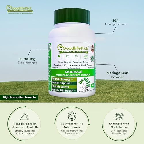 [MAXIMUM BENEFITS & ENHANCED ABSORPTION] : Moringa! Most Nutrient Loaded Plant On Earth with | ** 92 NATURAL VITAMINS** | ** 46 ANTI-OXIDANTS* |**18 AMINO ACIDS. Moringa is renowned for its antioxidant-rich properties, supporting immune health, energy levels, and overall wellness. The addition of Black Pepper Extract (Piperine) enhances bioavailability, ensuring your body absorbs more of the vital nutrients. Perfect for those seeking a natural, plant-based supplement to support digestive health, and vitality.