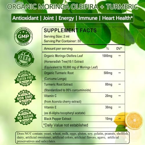 Pure Moringa Oleifera Liquid Drops, Organic Moringa Leaf Extract w. Turmeric, Black Pepper, Moringa Supplement for Energy Metabolism Immune Skin Joint & Gut, 6X Stronger Than Moringa Capsules Powder