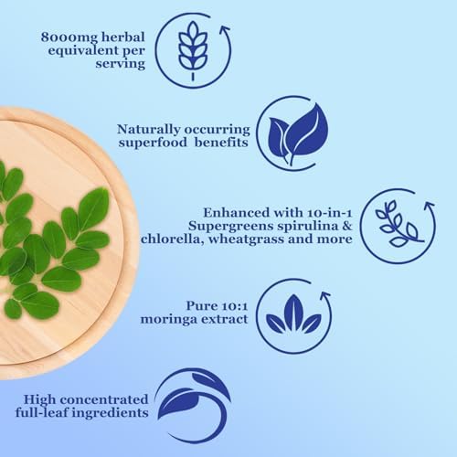 10-in-1 Super Greens & Moringa Complete Formula: Best Moringa supplements for women & men combining 10:1 concentrated Organic Moringa Extract (1000mg from 10,000mg of organic Moringa oleifera leaf) with a powerful green antioxidant superfood blend of spirulina, chorella, wheatgrass, barley grass, alfalfa grasswhole leaf, spinach, alfalfa sprout, broccoli sprout, parsley, berberine HCI. This multi 10-in-1 moringa natural green antioxidant superfood blend supplements formula delivers complete daily wellness support through powerful antioxidant, metabolic, immune and digestive health enhancement