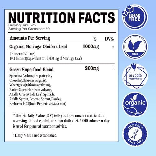 Pure Moringa Organic Oleifera Leaf Liquid Drops, 10:1 Extract Green Superfood Antioxidant Blend of Spirulina Wheatgrass & Barley Grass, 6X Absorption Than Moringa Capsules Powder Oil for Energy Immune