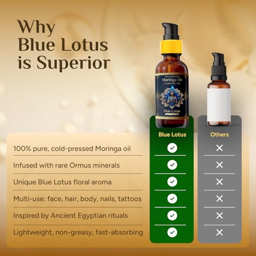 Pure Organic Moringa Oil with Blue Lotus Flower – Deep Hydrating & Anti-Aging Ritual Oil for Skin, Hair & Nails – Premium 100% Cold Pressed Moringa Seed Extraction, Nourishes & Hydrates Skin 2oz.