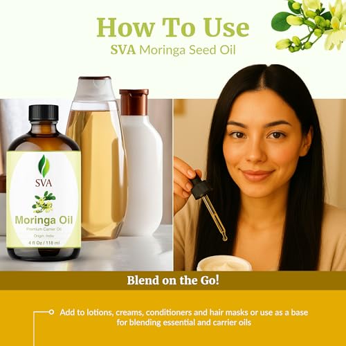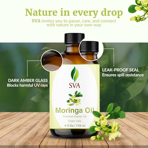 SVA Moringa Seed Oil – 4 Fl Oz – 100% Natural Cold Pressed Moringa Oil – for Face, Skin Care, Hair Care, Scalp Massage & Body Massage – Carrier Oil with Dropper