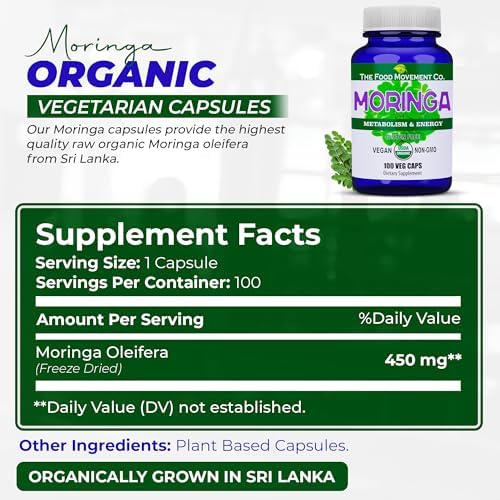 The Food Movement CO. Moringa – Certified Organic Superfood, Whole Body Wellness, Natural Energy Support, Supports Healthy Metabolism – 100 Vegan Capsules