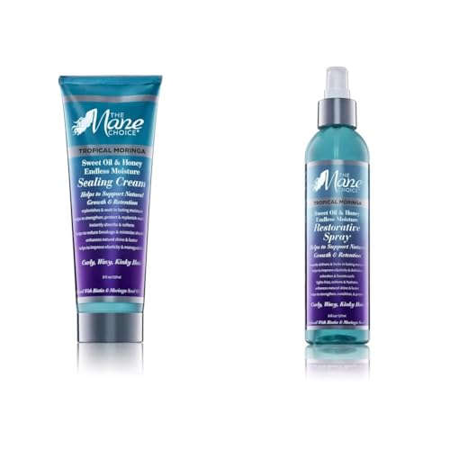 Get the ultimate hair care bundle for curly, coily, and textured hair types with The Mane Choice Tropical Moringa Sweet Oil & Honey Endless Moisture duo. This set combines an 8 oz sealing cream and 8 oz restorative spray to deliver deep hydration, nourishment and lasting moisture. The rich, creamy formula of the sealing cream penetrates strands to improve elasticity and minimize breakage and frizz. Moringa oil, biotin, and vitamin E support growth and retention for healthier, longer and thicker hair. Meanwhile, the restorative spray revives, softens, and protects hair. Infused with biotin and moringa seed oil, it conditions strands, leaving hair shinier, stronger, and more resilient. Both formulas feature premium ingredients and are free of mineral oil, petrolatum, parabens, sulfates and formaldehydes. They can be used individually or layered together for optimal moisture retention and curl definition. Simply smooth the sealing cream onto clean, damp hair before styling, then finish with the restorative spray to boost shine and refresh second-day curls. With this bundle, experience the transformative power of The Mane Choice’s nutrient-rich formulas.