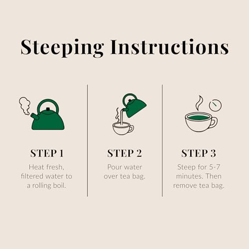 STEEPING INSTRUCTIONS: Simply heat fresh, filtered water to a rolling boil. Then pour 6 oz of water over tea and steep for 5-7 minutes. After steeping, add the used tea bags to compost or soil — they make gardens happy.