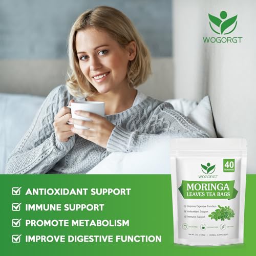 WOGORGT Organic Moringa Tea Bags – Pure Moringa Leaves Herbal Tea from India – Rich in Natural Antioxidants & Supports Daily Wellness – Caffeine Free, Sugar Free, Vegan – 40 Tea Bags
