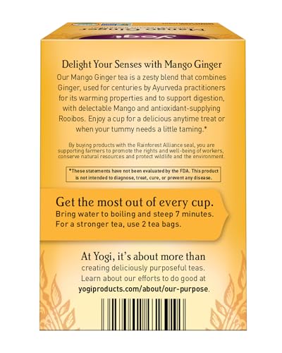 Yogi Mango Ginger tea is a zesty, spiced herbal tea blend that combines Ginger, used for centuries by Ayurveda practitioners to support digestion, with delectable Mango, antioxidant-supplying Rooibos, and traditional warming spices including Cinnamon and Cardamom. Enjoy a cup of Yogi Mango Ginger tea when your tummy needs a little taming, or whenever you want to enjoy a delicious, tropical treat.*
